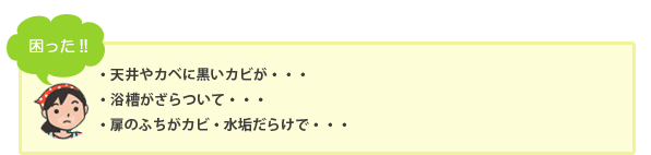 *コーキングや目地など素材内部に入り込んでいるカビは完全に取りきれない場合があります。 *浴室内のイス・洗面器・窓のブラインド・シャンプー・リンス等は対象外です。ご希望のお客様は別途ご相談ください。 |